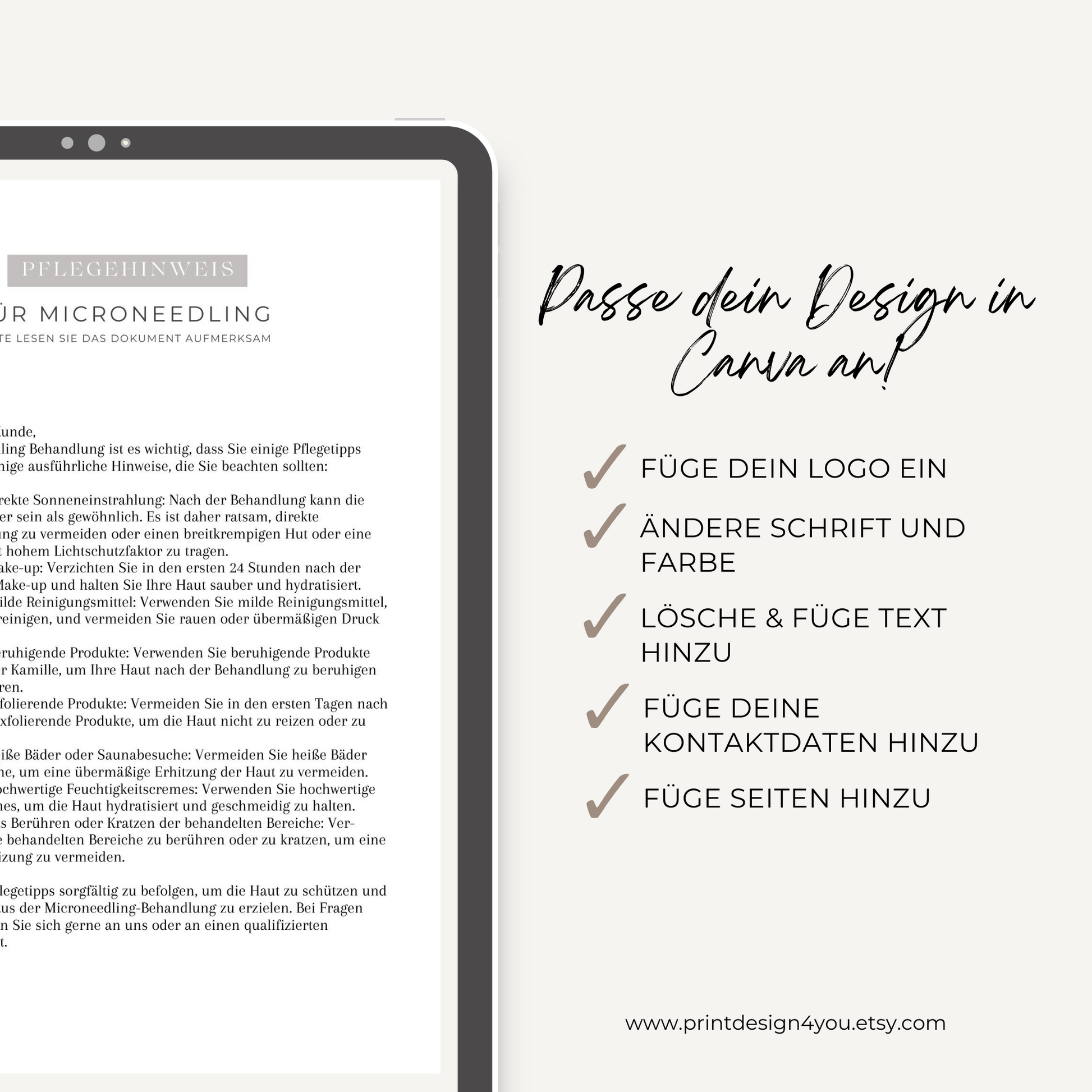 Das Pflegehinweis-Formular ist ideal für Kosmetikstudios, Hautspezialisten und Beauty-Profis, die Microneedling-Behandlungen anbieten und ihren Kunden eine strukturierte, verständliche Nachsorge ermöglichen möchten.