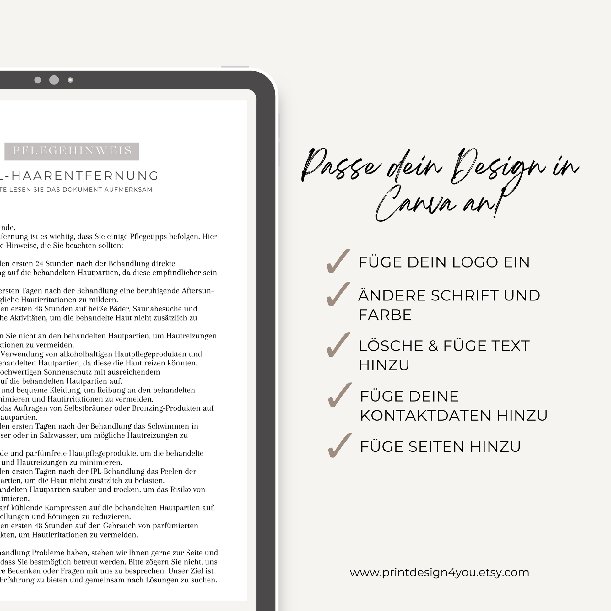 Die richtige Nachsorge nach einer IPL-Haarentfernung ist entscheidend, um die Haut zu beruhigen, Irritationen zu vermeiden und optimale Ergebnisse zu erzielen. Mit unserem Pflegehinweis-Formular erhalten Ihre Kund:innen klare, leicht verständliche Anweisungen für eine schonende und effektive Nachbehandlung.