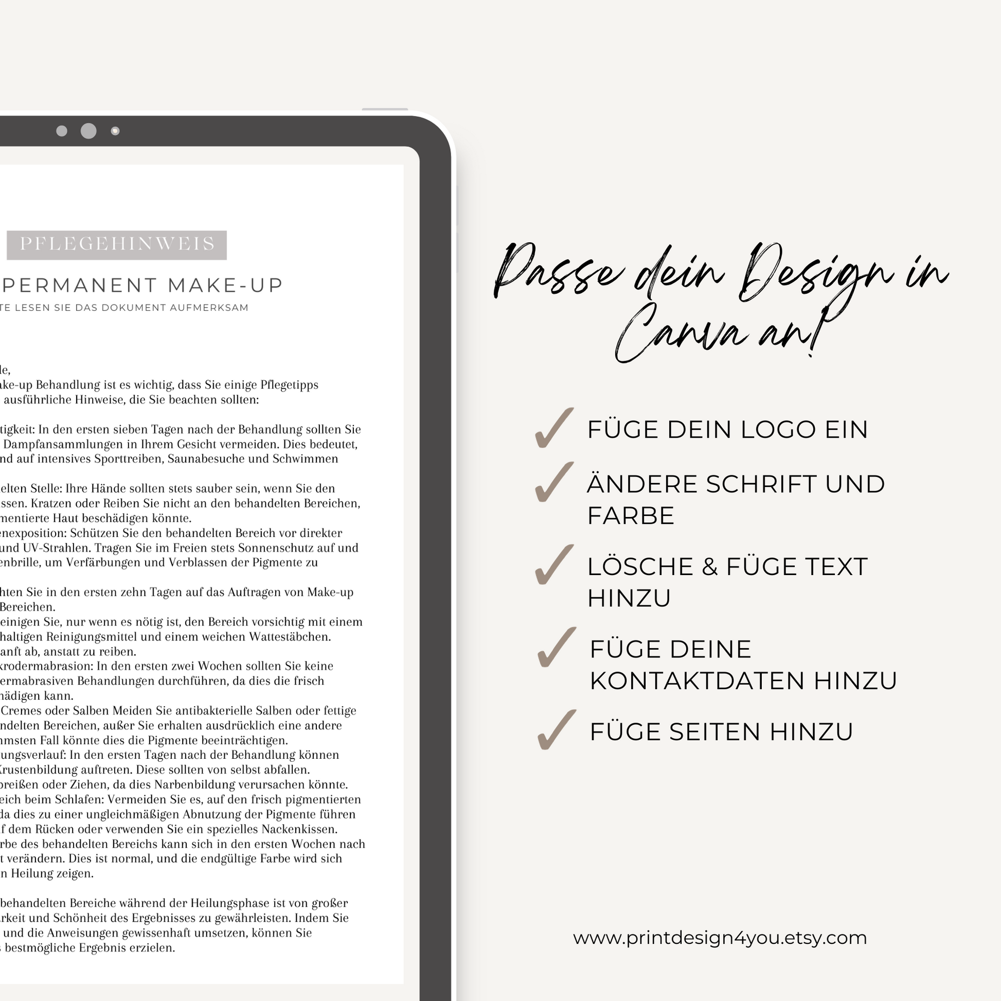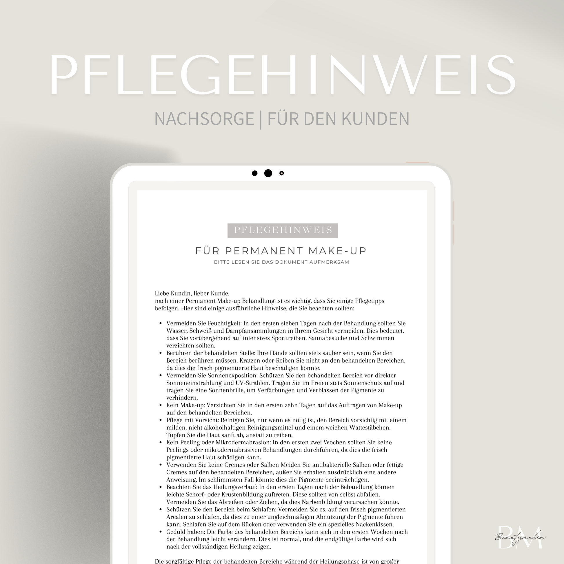 Laden Sie das Pflegehinweis-Formular jetzt herunter und sorgen Sie für eine professionelle Nachsorge Ihrer Permanent Make Up Behandlungen. Entdecken Sie auch unsere weiteren Vorlagen und Formulare, die Ihren Studioalltag erleichtern und Ihre Kundenbindung stärken.